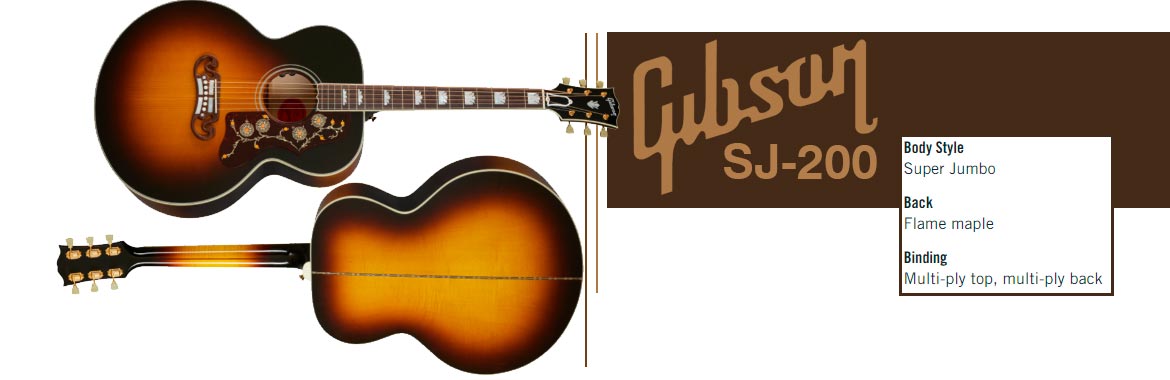 O Gibson SJ-200 é um dos modelos mais conhecidos da Gibson. Ele foi fabricado pela primeira vez em 1937 e ainda é produzido hoje. O SJ-200 apresenta um tampo de abeto Sitka maciço, laterais e fundo de bordo ondulado e um acabamento nitrocelulose de alto brilho. O preço varia dependendo do ano de fabricação e das características do instrumento.